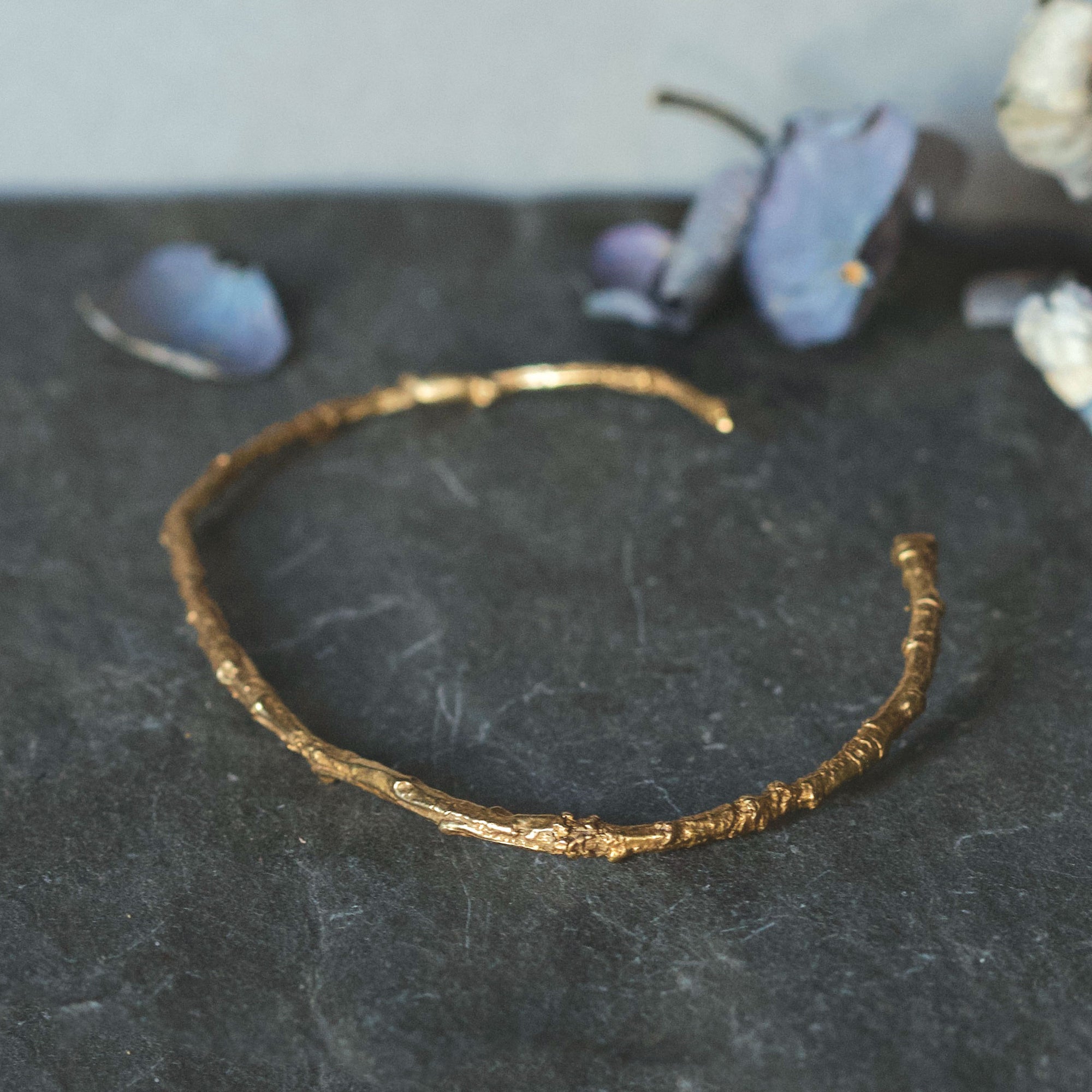 This cuff is created from nickel free brass. This was created by taking a mold of a twig found while hiking in Montauk. Slightly adjustable by gently squeezing the metal.