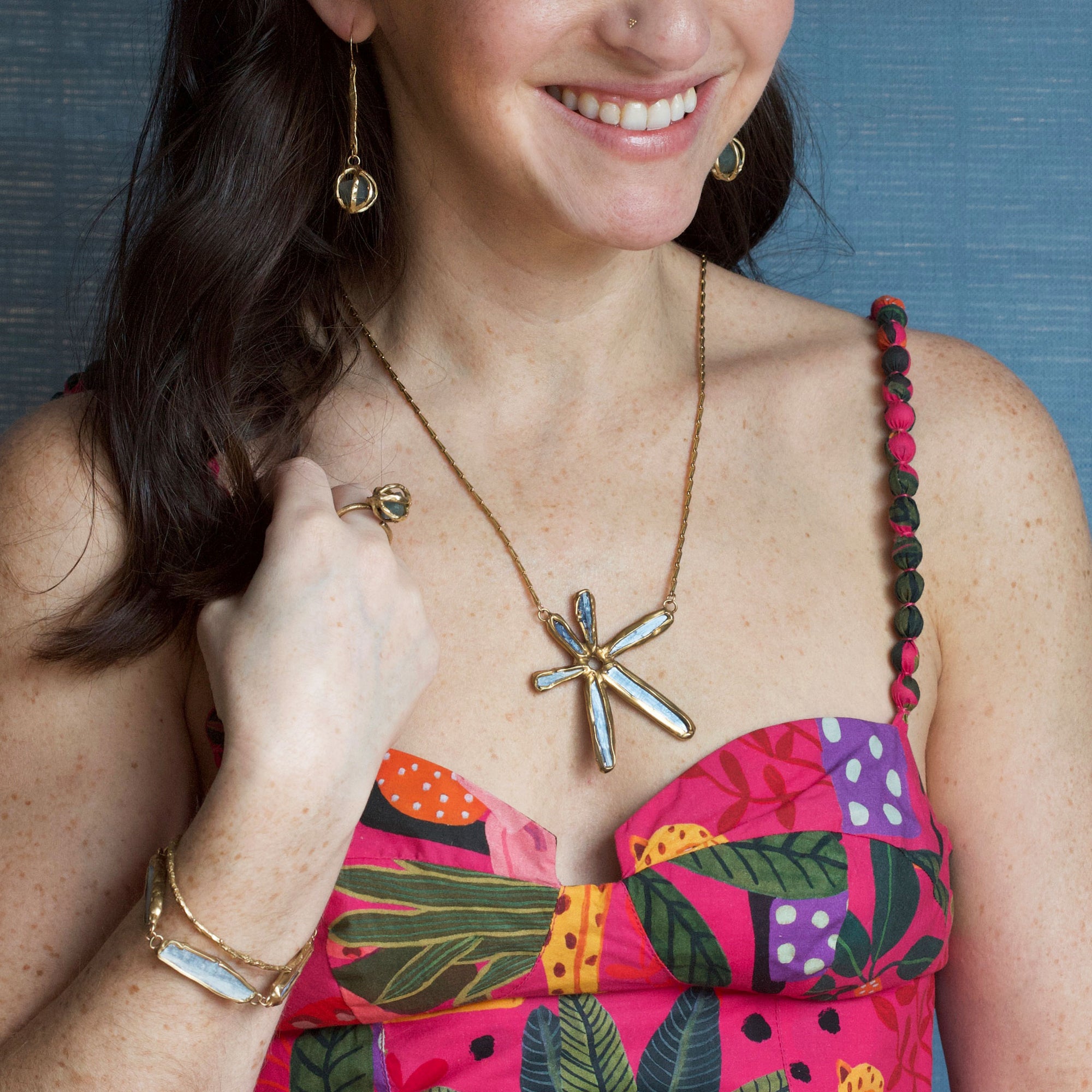 Cross Pollinate celebrates the subtle magic of nature’s collaborations. Each piece reflects the beauty that emerges when forms, colors, and textures meet and mingle — petals intertwining, metals converging, stones catching light in a dance of shared brilliance. Inspired by six-petaled blooms, delicate blossoms, and the gentle alchemy of spring, this collection is about connection, transformation, and the quiet power of harmony.